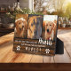 Personalized pet memorial plaque featuring 3 photographs of your beloved pet, a rustic wooden background, and a sympathy quote that reads "you left paw prints on our hearts and we are forever changed", two paw prints with a heart centre, your dogs name, and the dates. A wonderful keepsake and tribute of your precious family pet dog or cat. Also makes a great remembrance sympathy gift.