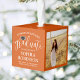 Commemorate the graduate's achievement with a custom 3 photo orange, black and white graduation cube Christmas ornament. Pictures and wording on this template are simple to customize. (IMAGE PLACEMENT TIP: An easy way to center a photo exactly how you want is to crop it before uploading to the Zazzle website.) Include any favorite inspirational quote, motivational saying, school name and degree, congratulations, thanks mom and dad, or other message of your choice. The orange, black and white design features cute mortar board cap, elegant handwritten style script calligraphy, stylish modern minimalist typography, and two photos of your choice, such as senior pictures or images from the commencement ceremony. Makes a thoughtful keepsake graduation gift idea. Congratulations to the graduate!