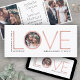 Announce the joyful news of your engagement and upcoming wedding with unique custom photo save the date invitations. The 3 pictures and all wording on this template are simple to personalize. The magnetic back makes them easy for friends and family to display. (IMAGE PLACEMENT TIP: An easy way to center a photo exactly how you want is to crop it before uploading to the Zazzle website.) The white, pink and black design features three pictures of the engaged couple, modern minimalist typography, and the word "LOVE" in faux rose gold foil as part of the phrase "the greatest of these is love" from the Corinthians Bible verse. Please note that rose gold is printed color, not metallic foil. This stylish announcement note card is an elegant way to inform friends and family of your upcoming special day celebration. Congratulations to the bride and groom!