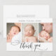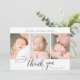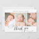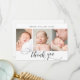 Simple Modern Elegant Calligraphy Script 3 Photo Collage Newborn Baby Thank You Birth Announcement Card. Features a beautiful "thank you" text in a hand lettered typography or calligraphy swash tail font script. Great for baby boy or baby girl. Pre-made personal message and birth statistics with baby's name are included in black and white. Easy to personalize with your baby photo and details.