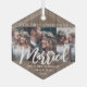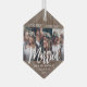 Celebrate a joyful 1st holiday as Mr. & Mrs. with a custom 3 photo collage "Our First Christmas Married" faux wood glass hexagon ornament. All wording and pictures on this template are simple to personalize. If preferred, the script typography can read "Together" or "Engaged." (IMAGE DESIGN TIP: An easy way to center a photo exactly how you want is crop it before uploading to the Zazzle website.) The modern farmhouse design features rustic brown faux wood, handwritten style script calligraphy, typewriter typography names & year, and three pictures of your choice. This unique & modern keepsake adds a stylish touch to Xmas home decorations. Makes a cute wedding gift idea for the bride and groom.