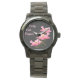 The watch face features a three pink Papaver Poppy flower design. The crinkled crepe paper-like, delicate poppy petal texture forms a bed for the pollen coated stamen. The original pink poppy photograph was been digitally altered and stacked to form the tiered design. Personalize the template field with your words, remove the text or click customize to select a font style, size, and color you prefer.