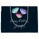 A personalized happy birthday gift bag (large size) with a pretty design. 3 watercolor butterflies, painted pink, purple and green. Dark blue watercolor background.