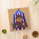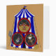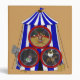 A group of 3 funny anthropomorphized gold rings that run a 3 ring circus with the help of an elephant, a horse, and a rabbit. One ring is the ringmaster, strongman, and lion tamer, one ring is the clown, trapeze artist, and juggler, and the other ring is the acrobat/horse rider, magician, and bugle player. The horse is a tightrope walker. Each ring shows off in its own scene, shown through a red ring superimposed on a big blue circus tent with sawdust barrels out front. The happy elephant is peeking around the edge and reaching for some peanuts.
