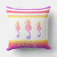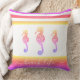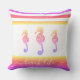 “Beach life”. Whenever you relax on this seaside throw pillow, you can be rest assured the summer seashore fun will continue. Three graphic, rainbow yellow, orange, pink, and purple ombre vintage seahorses overlay a crisp, white background with sandy textured rainbow stripes. Both indoor and outdoor fabric choices available. Great for the family beach house, your nautical lifestyle, or just to bring a bit of the beach into your home all year round!