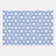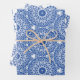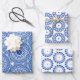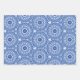 set of 3 sheets of blue and white gift wrap with circular design patterns