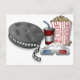 3D glasses with a movie reel, popcorn and soft drink.