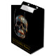 Present your gifts with captivating artistry using this striking gift bag featuring the detailed 3D Day of the Dead skull design. The design showcases a black base, richly adorned with vibrant and intricate floral and scroll patterns in contrasting metallic gold, teal, and copper, embodying the spirit of Día de los Muertos. These traditional sugar skull decorations include stylized marigolds (cempasúchil), the iconic flower of Día de los Muertos, along with swirling vines and symbolic flourishes. The metallic accents give the skull a dimensional, almost embossed appearance, making these culturally significant details truly pop. Across the bag, a prominent banner provides a customizable text field, allowing you to add a recipient's name, a short message, or a festive greeting, making this gift bag a unique and memorable way to present your thoughtful presents.