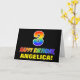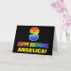 The front of this colorful, cheerful, and fun birthday themed greeting card design features a large number "3" and the message "HAPPY BIRTHDAY,", both colored with a rainbow spectrum gradient inspired pattern, along with a bold yellow custom recipient name. The front also has a plain black colored background. The inside features a custom birthday greeting message, or could perhaps be cleared and left blank if a message is to be written by hand instead. A cheerful customizable birthday card like this might be a fun way to acknowledge somebody’s third birthday. [~Z0000472]