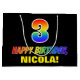 This cheerful, colorful, and fun birthday themed gift bag design features a large number "3" and the message "HAPPY BIRTHDAY,", both colored with a rainbow spectrum gradient inspired pattern, along with a bold yellow personalized recipient name. The background is colored black. A fun birthday themed gift bag like this might be used when giving a gift or present in celebration of somebody’s 3rd birthday. [~Z0000477]