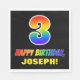 This cheerful, fun, and colorful birthday paper napkin design features a large number "3" and the message "HAPPY BIRTHDAY,", both having a rainbow spectrum gradient inspired pattern coloring, along with a bold yellow custom recipient name. The background is colored black. Birthday themed paper napkins like this might be fun to use at a party being held to celebrate somebody’s 3rd birthday. [~Z0000476]