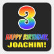 This colorful, fun, and cheerful birthday sticker design features a large number "3" and the message "HAPPY BIRTHDAY,", both colored with a rainbow spectrum gradient inspired pattern, along with a bold yellow editable name. The background is colored black. Fun stickers this might be used when wrapping a gift or present in honor of somebody’s third birthday, or perhaps may be given out to the attendees at a birthday celebration or party. [~Z0000480]