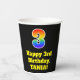 This colorful and fun birthday paper cup design features a large number “3” having a rainbow spectrum gradient inspired pattern. It also features the message “Happy 3rd Birthday,”, and a customizable name. The background is colored black. Colorful, vibrant paper cups like this might be fun to use at a birthday party being held to celebrate somebody’s third birthday. [~Z0000537]