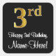 This elegant, sophisticated, and luxurious birthday-themed sticker design features a large ordinal number “3rd” having a faux/imitation gold-like look, along with the birthday greeting message “Happy 3rd Birthday,” and an editable name in a script-style font. It also has a black-colored background. Luxurious stickers like this might be used when wrapping gifts being given to somebody in celebration of their 3rd birthday, or perhaps may be handed out to the guests at a birthday celebration. [~Z0000517]