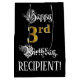 This fancy and luxurious birthday themed gift bag design features the message “Happy 3rd Birthday,”, along with a custom recipient name. Some of the message is in an elaborate script-style text, the large number “3rd” features a faux/imitation gold-inspired look pattern, and the background is colored black. A birthday themed giftbag like this might be used when giving a gift or present in celebration of somebody’s third birthday. [~Z0000560]