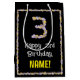 This fun, nature-inspired birthday-themed giftbag design has the message “Happy 3rd Birthday,” along with a customizable recipient name. The large number “3” plus the border both consist of flower icons. A birthday themed giftbag like this might be a fun way to wrap a present or gift being given to celebrate somebody’s third birthday. [~Z0000653]