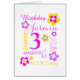 Modern text and flower 3rd birthday short name personalized birthday girls card, featuring graphic flowers and your own short name in purple, pink, white, and yellow. Personalize with your child's name (please note not all names will fit due to the nature of the font) and single-digit kids age, currently reads Jasmin 3, and your own special photo inside. Other name lengths are available, if you need assistance contact me, happy to post one for your name. Matching gift wrap also available. A great way to give a personalized touch to a third birthday girl's gift. Uniquely designed by Sarah Trett for www.mylittleeden.com