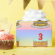 This colorful and cheerful birthday wrapping paper design features a cartoon-style depiction of a three-tier birthday cake having a numeral-shaped candle on top showing the number “3“, along with the message “HAPPY 3RD BIRTHDAY,”, and a personalized recipient name. The background has a multi-color pastel rainbow spectrum inspired gradient pattern. Upbeat birthday themed wrapping paper like this might be a fun way to wrap a gift or present being given to celebrate somebody’s third birthday. [~Z0000622]