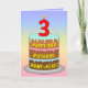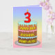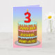 This joyful and colorful birthday greeting card design features a cartoon-style depiction of a three-tier birthday cake having a numeral-shaped candle on top showing the number “3“, along with the message “HAPPY 3RD BIRTHDAY,”, and a customizable recipient name. The background of the front has a multi-color pastel rainbow spectrum inspired gradient pattern. The inside features a custom birthday greeting message, or could perhaps be cleared and left blank if a message is to be written by hand instead. A fun, personalized birthday greeting card like this might be a fun way to send some birthday wishes to somebody who is celebrating their third birthday. [~Z0000625]
