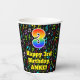 This cheerful and fun music themed birthday paper cup design features a large number “3” having a rainbow spectrum gradient inspired pattern. It also features the message “Happy 3rd Birthday,”, and an editable name. The background features an exciting and colorful pattern having music notes and symbols of various colors and sizes. Vibrant, colorful paper cups like this might be fun to use at a birthday celebration being held to celebrate somebody’s third birthday. [~Z0000541]