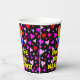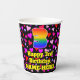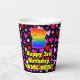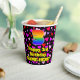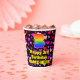This colorful and fun birthday-themed paper cup design features a large number “3” with a rainbow spectrum gradient inspired pattern, along with the message “Happy 3rd Birthday,”, and a personalized name. The background features a pattern of heart shapes with colors like pink, red, and purple. Loving, happy paper cups like this might be fun to use at a birthday celebration being held to celebrate somebody’s third birthday. [~Z0000548]