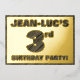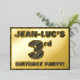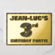 The front of this bold third birthday celebration/party foil invitation card features an editable name, a large number “3rd”, the message “BIRTHDAY PARTY!”, and a border, all featuring a rustic, yet elegant, faux wood grain appearance inspired pattern. The back features personalized details about the event, such as the date, time, venue/place, and any other useful information. Customized invitations like these might be used to invite guests to a birthday gathering being held to honor somebody’s 3rd birthday. [~Z0000595]