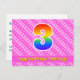 The front of this happy, cheerful, and upbeat birthday-themed postcard design features a large number "3" with a rainbow spectrum gradient inspired pattern, along with the message "Happy 3rd Birthday,", and a customizable recipient name. The front additionally has a happy dark pink and light pink striped pattern containing heart shapes. The back features an editable birthday greeting message, or could perhaps be cleared and left blank if a message is to be written by hand instead. A personalized birthday postcard like this might be a fun way to send a message celebrating somebody’s third birthday. Postcards like this might also be used to invite guests to a birthday celebration or party being held for somebody who is turning 3 years old. [~Z0000449]