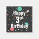 Rocket ships, comets and planets in black outer space for a child's 3rd birthday.