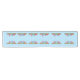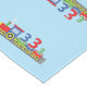 Our colorful 3rd birthday table runner showcases a delightful and brightly colored train carrying three number threes. A colorful pattern of the red, blue, yellow and green train is running across both sides of the runner. The background is set in a sky blue, setting off the train.