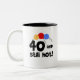 Primary colors balloons and black text that reads "40 and still hot!" on 40th birthday T-shirts, mugs, buttons, cards, and other birthday gear!