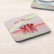 Beverage coaster with my artwork of two ruby hearts floating on the water under a rainbow. Customizable text says "40 Years".