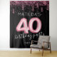 Personalized 40th birthday party photo booth backdrop featuring a trendy black background, pink glitter and confetti, 40 pink hellium balloons, their name, and date.