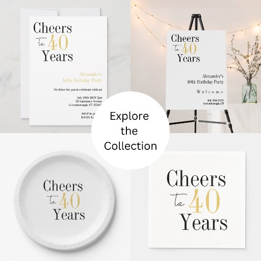 This is a stylish, 40th birthday party design. It is a simple, minimal typography "Cheers to 40 years" design, in classic black and white, with light gold colored accents. Perfect for a chic 40th birthday party or celebration. This design is fully customizable, simply use the personalize this button to change the age, or the rest of the text, or use the editing tool to change the color or font. If you need help with personalization, matching products, or for a custom design, contact me via zazzle chat or email: ursuladawnmoon@gmail.com