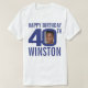 Happy 40th Birthday navy blue and white text, custom front, and back photo, and name t-shirt. Fun 40th personalized photo in classic dark blue and contrasting white birthday tee design. Personalize this birthday shirt with two photographs of the birthday person in the middle of the number 0 on the front and back ideal for a past and present photo opportunity. Great idea for adding some fun to a milestone fortieth birthday party, event, wave, or birthday drive by. Other matching items and colors are available. Exclusive design by Sarah Trett for www.mylittleeden.com