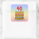 This fun and joyful birthday square sticker design features a cartoon-style depiction of a three-tier birthday cake having number-shaped candles on top showing the age “40“, along with the message “HAPPY 40TH BIRTHDAY,”, and a personalized recipient name. The background features a multicolored pastel rainbow spectrum inspired gradient pattern. Colorful birthday themed stickers like these might be used or given out at a party for somebody who is celebrating their 40th birthday, or perhaps used when preparing gifts/presents or invitations for such an event. [~Z0000624]