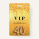 A modern, stylish and glamorous badge for a 40th birthday party. A fauc gold metallic looking background with faux glitter drip, paint dripping look. The name is written with a modern hand lettered style script. With the text: VIP Number 40 is written with a balloon style font, script.