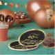 Modern and elegant black background with faux gold music notes for a 40th birthday party. Templates for the age 40 and name. The name is written in a hand-lettered style script. Golden letters and number. For both him and her.