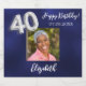 A navy blue background. The blue color is uneven. Personalize and add a date, name and a photo. Age number written with a faux silver looking balloon style font.