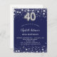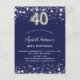 A modern, stylish and glamorous invitation for a 40th birthday party. A navy blue background, decorated with faux silver stars. Personalize and add your name and party details. Number 40 is written with a balloon style font.