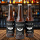 A modern beer bottle label for a 40th birthday party for guys in black and white. With the text: Hello 40. With an image of a beard. Templates for a name and date. Black background color.