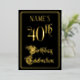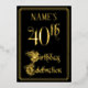 The front of this opulent and ornate foil fortieth birthday party/celebration invitation design features the message “40th Birthday Celebration” in luxurious script-style text. It also has an editable name. The background of the front is colored black by default (although it can be customized to a different color). The back features personalized details about the event, such as the date, time, location, and any other relevant information. Fancy, elegant, editable invitations like these might be used to invite guests to a birthday party being held in celebration of somebody’s fortieth birthday. [~Z0000589]
