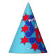 Bright star patterned Personalized custom photo and name birthday party hat. Ideal for a special boys 40th birthday party celebration. Colorful red and blue star design. Background colour can also be changed for your own choice currently light blue. Original art and design by Sarah Trett. www.sarahtrett.com for www.mylittleeden.com