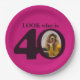 Celebrate a 40th Birthday with these fun look who is 40 photo paper plates. Personalise these age party disposable paper plates with a photograph of the birthday girl. Great idea for adding some fun to a birthday party. Can be used to show baby photos or other fun or embarrassing photos over your birthday girls thirty years by order several packs with different photos on. Design by Sarah Trett.