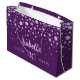 An elegant and glamorous 40th birthday gift bag. Girly purple backdrop and faux diamonds. Templates for a name, age 40, date of birth and date of the anniversary. Pink colored letters and numbers. The name is written with a modern hand-lettered style script.