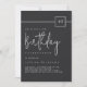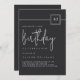 The modern minimalist layout pairs a deep matte black background with refined ivory-beige typography—featuring a bold sans-serif for the event details and a graceful handwritten script for the word “Birthday.” A sleek square badge highlights the milestone age, adding a sophisticated touch for any adult birthday celebration.