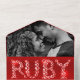 Ruby 40th wedding anniversary party or event with photo and detachable RSVP invitations can be sealed so no envelope is required. A beautiful ruby in gemstones graphic wedding anniversary invitations, personalize with your own wedding anniversary party details, a photo of the happy couple. Make it easy for you and your guests to send as no envelope is required simply handwrite on your sealed invitations and your guests can reply with the detachable rsvp and affixing a stamp for quick and easy guest responses. The fortieth wedding anniversary is associated with the red gemstone ruby. Other matching items are available. Graphics and design by Sarah Trett for www.mylittleeden.com