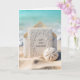 A beautifully embossed wedding invitation card rests inside an envelope on the sand near the ocean's edge, accompanied by a sand dollar for a 40th wedding anniversary.