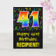 The front of this fun, vibrant, and colorful birthday-themed greeting card design features a large number "41" with a rainbow spectrum gradient inspired pattern, along with the message "Happy 41st Birthday,", and a personalized recipient name. The front also has a colorful music notes and symbols pattern. The inside features a customizable birthday greeting message, or could perhaps be cleared and left blank if a message is to be written by hand instead. A customizable birthday card like this might be a fun way to send a message in celebration of somebody’s forty first birthday. [~Z0000420]