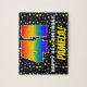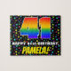 This bold and joyful birthday-themed jigsaw puzzle design features a large number “41” with a multicolored rainbow spectrum inspired gradient pattern, along with the message “HAPPY 41st BIRTHDAY,”, and a custom recipient name. The background has a fun, multicolored star field pattern. An eye-catching, personalized birthday puzzle like this might be a fun way to deliver birthday wishes to somebody who is celebrating their forty-first birthday. [~Z0000607]