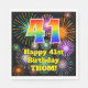 This joyful and fun birthday themed paper napkin design features a large number “41” having a colorful rainbow spectrum gradient inspired pattern. It also features the message “Happy 41st Birthday,”, and a personalized name. The background features an exciting and colorful pattern inspired by the appearance of bursting celebratory fireworks. Colorful birthday themed paper napkins like this might be used at a birthday party for somebody who is celebrating their forty first birthday. [~Z0000574]